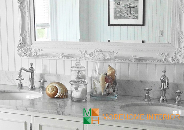 Vỏ ốc là vật trang trí quen thuộc trong nhiều thiết kế căn hộ, vì chúng dễ dàng liên tưởng tới biển, tới thiên nhiên mà lại nhỏ nhắn, không tốn quá nhiêu không gian để trưng bày. Sử dụng những vỏ ốc trong chai thủy tinh sẽ còn làm gia tăng thêm vẻ đẹp của chúng. Nếu trưng bày trong phòng tắm nữa thì càng tuyệt vời.
