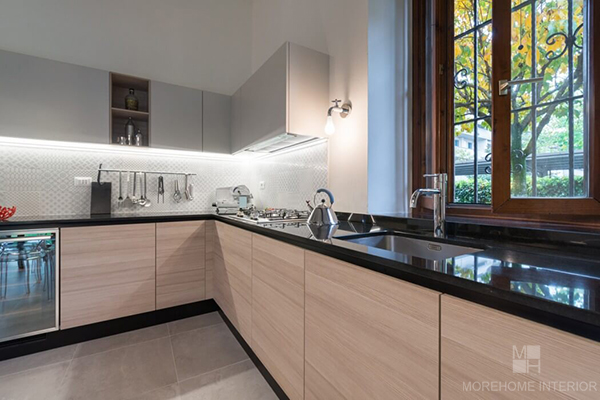 Căn bếp rộng rãi với khung cửa sổ lớn cho phép ánh sáng tự nhiên tràn vào bếp. Thiết kế tủ trên và tủ dưới tối giản tay cầm, tăng tính hiện đại và trang nhã cho nội thất nơi đây.