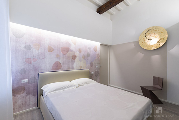 Phòng ngủ của bố mẹ với thiết kế màu sắc nhẹ nhàng. Nhờ những gam màu có độ chuyển sắc rất mượt mà của bức tường , cộng thêm chiếc đèn nghệ thuật hình tròn có màu vàng ấm áp mà không gian này toát lên sự thư thái và giàu tính nghỉ dưỡng.