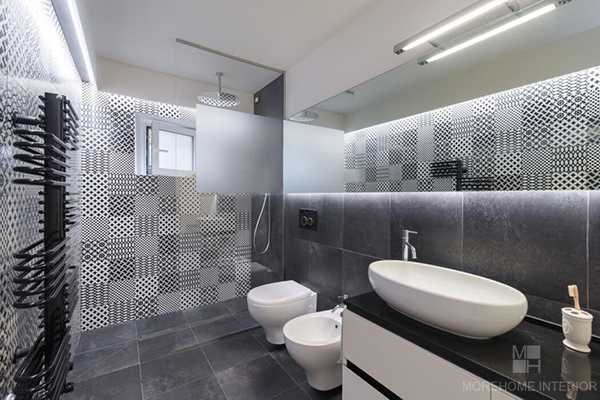 Phòng tắm của thiết kế căn hộ này được lát gạch mosaic trông đơn giản và sang trọng. Tủ và trần nhà được lắp đèn hậu, vì thế mà ánh sáng được phân bố rất đều trong không gian. Nội thất trong căn phòng theo hướng tối giản và nổi bật giữa nền sàn và tương trung tính.