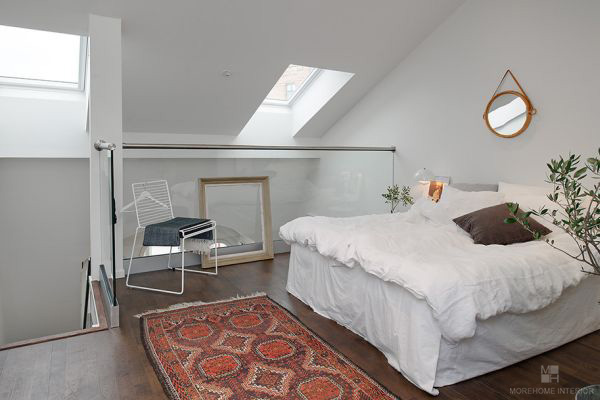 Phòng ngủ với tông màu trắng đơn giản và nội thất cũng không có nhiều nổi bật. Những đồ vật trang trí có kích thước phù hợp khiến cho không gian bớt trống trải. Đặc biệt tấm thảm trải nhà có màu nóng giúp căn phòng trở nên cân bằng hơn.